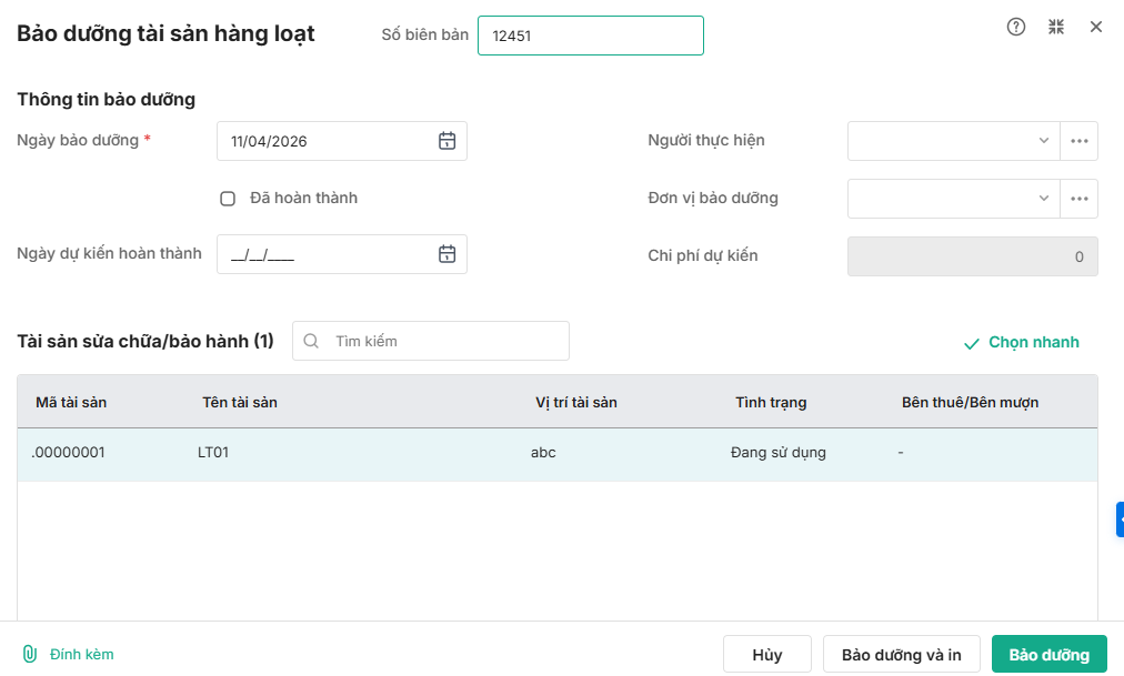 - Với các tài sản hoàn thành sửa chữa ngay, người dùng khai báo nhanh chi phí bảo dưỡng hoặc liệt kê chi tiết các hạng mục bảo dưỡng chi tiết theo từng dòng tài sản. Chương trình sẽ tự động tính tổng chi phí bảo dưỡng.