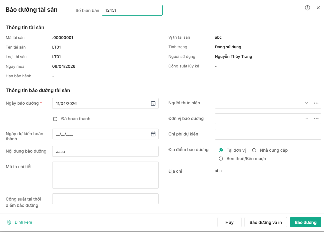 Bước 2: Khai báo các thông tin chi tiết của tài sản cần bảo dưỡng.