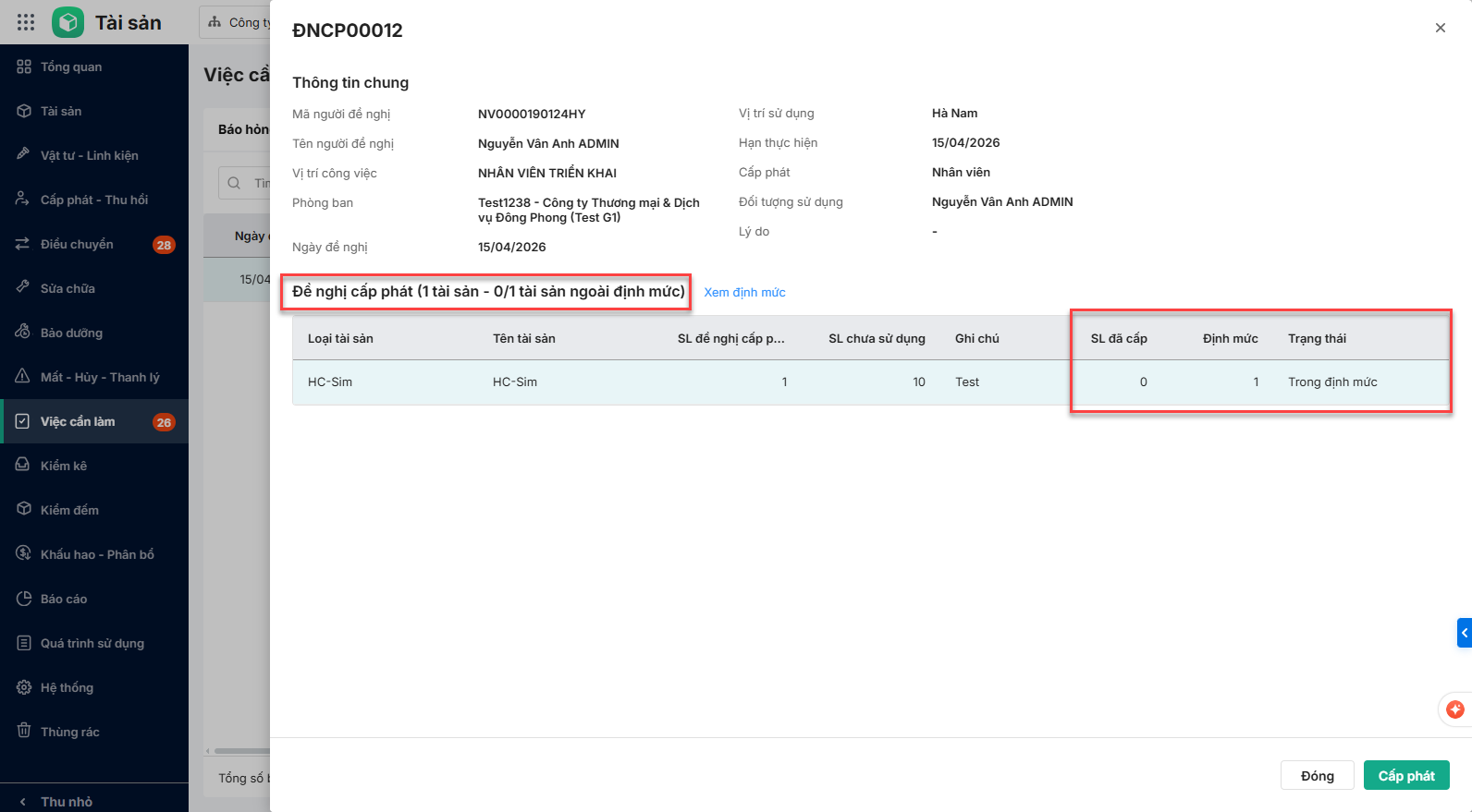 - Đồng thời người dùng cũng sẽ nắm được số lượng tài sản ngoài định mức trên danh sách đề nghị cấp phát: