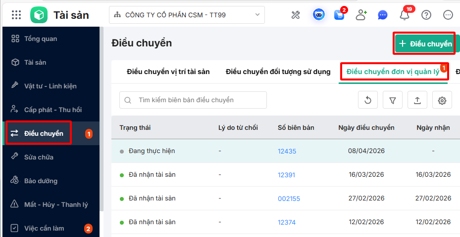 Bước 3: Sau khi khai báo xong thông tin, nhấn Điều chuyển. Thông tin biên bản điều chuyển vừa lập sẽ được ghi nhận và hiển thị trên phân hệ Điều chuyển, tab Điều chuyển đơn vị quản lý.