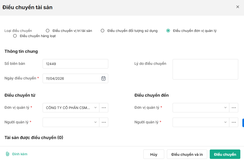Bài viết hướng dẫn tính năng điều chuyển đơn vị quản lý của tài sản khi tài sản được chuyển sang đơn vị quản lý mới trên phần mềm. Tính năng này hỗ trợ cập nhật kịp thời thông tin quản lý, đảm bảo minh bạch và chính xác trong công tác quản lý tài sản tại doanh nghiệp.