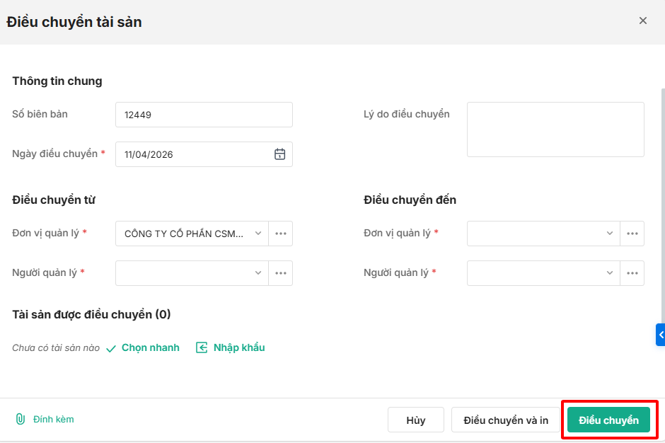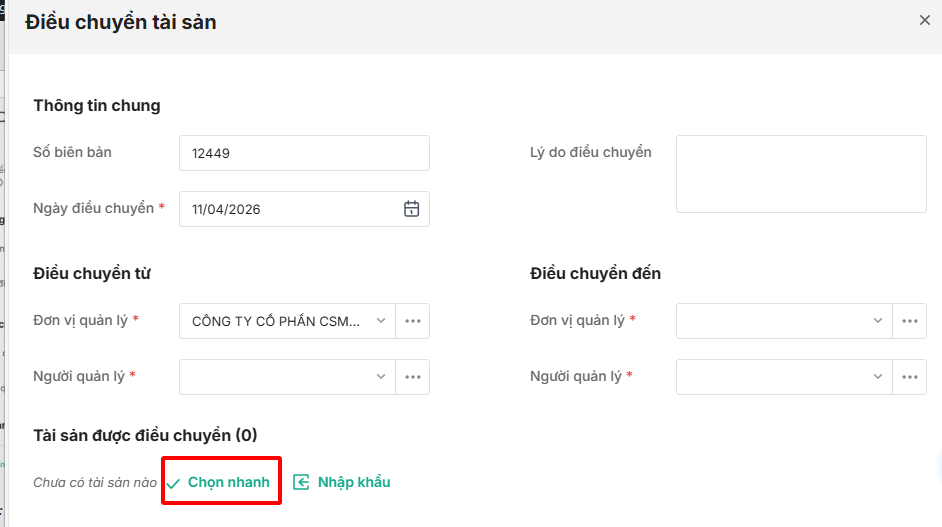 - Có thể chọn nhanh tài sản cần điều chuyển đơn vị quản lý bằng cách nhấn Chọn nhanh.