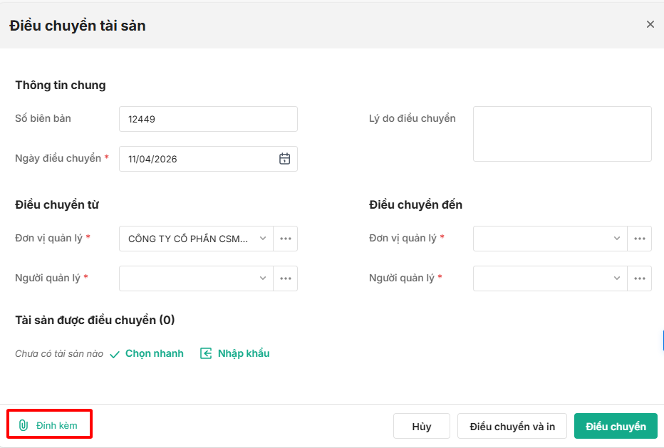 - Nhấn Đính kèm nếu có các hình ảnh, tài liệu liên quan đến tài sản cần điều chuyển đơn vị quản lý.