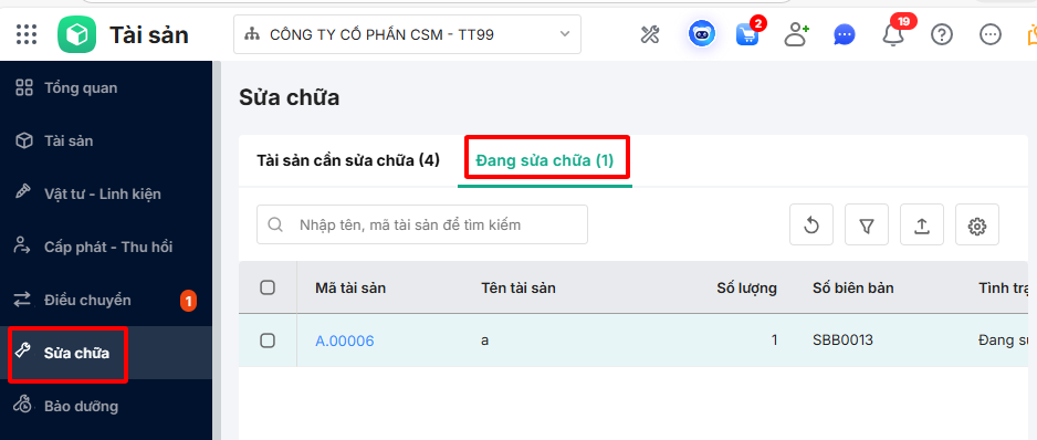 Bước 1: Trên giao diện AMIS Tài sản, vào mục Sửa chữa\Đang sửa chữa.