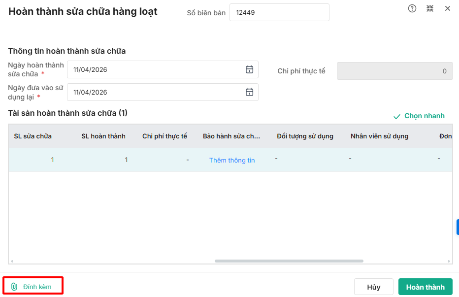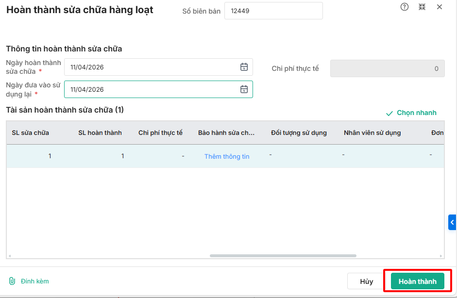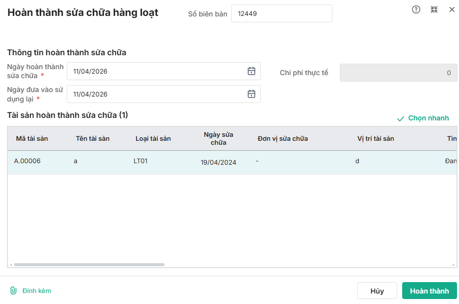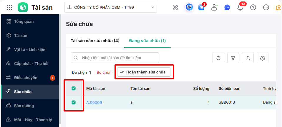 Bước 2: Tích chọn các tài sản đã hoàn thành sửa chữa. Chọn chức năng Hoàn thành sửa chữa/Hoàn thành bảo dưỡng.