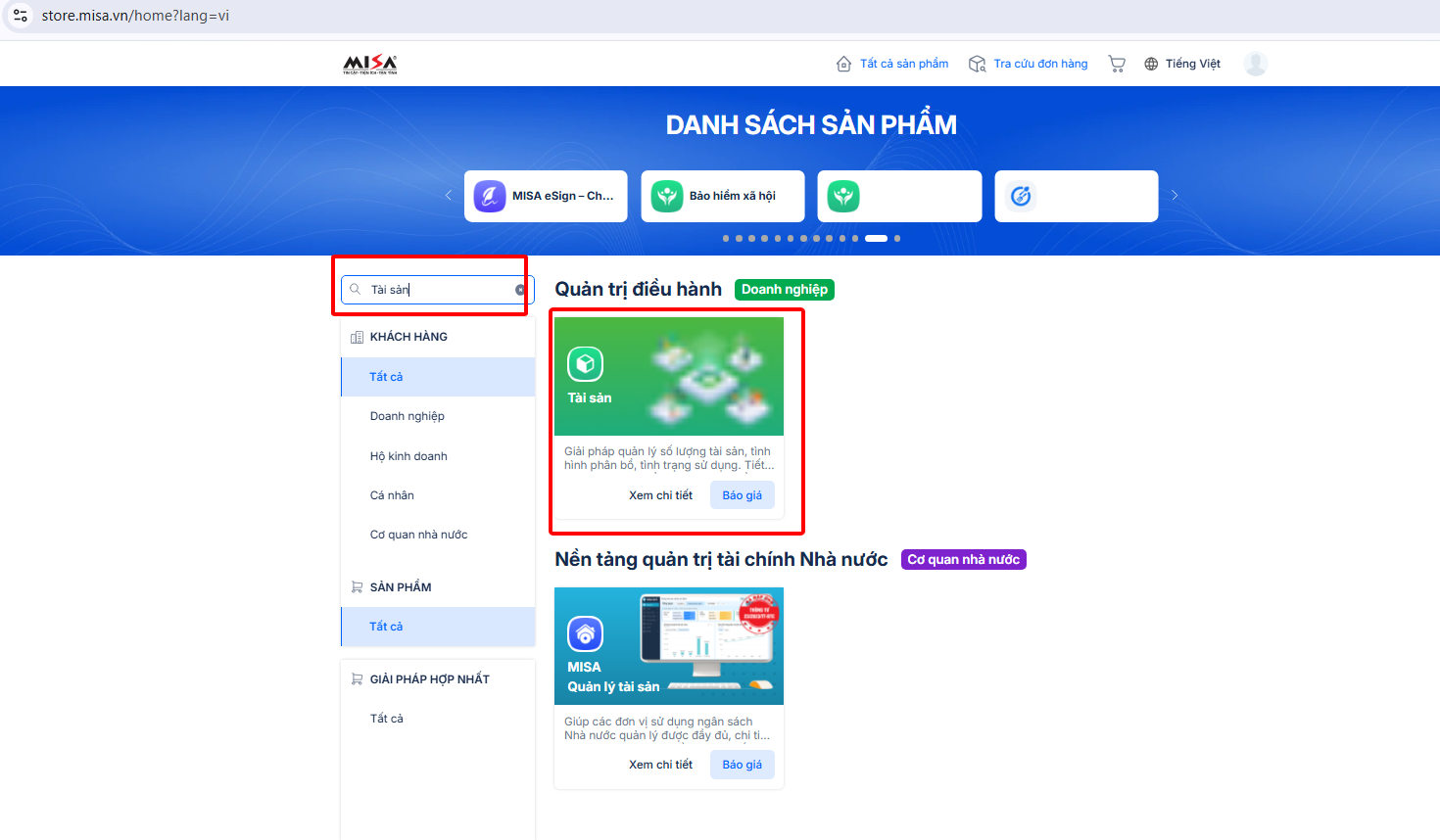 Bước 2: Chọn ứng dụng AMIS Tài sản, nhấn Báo giá