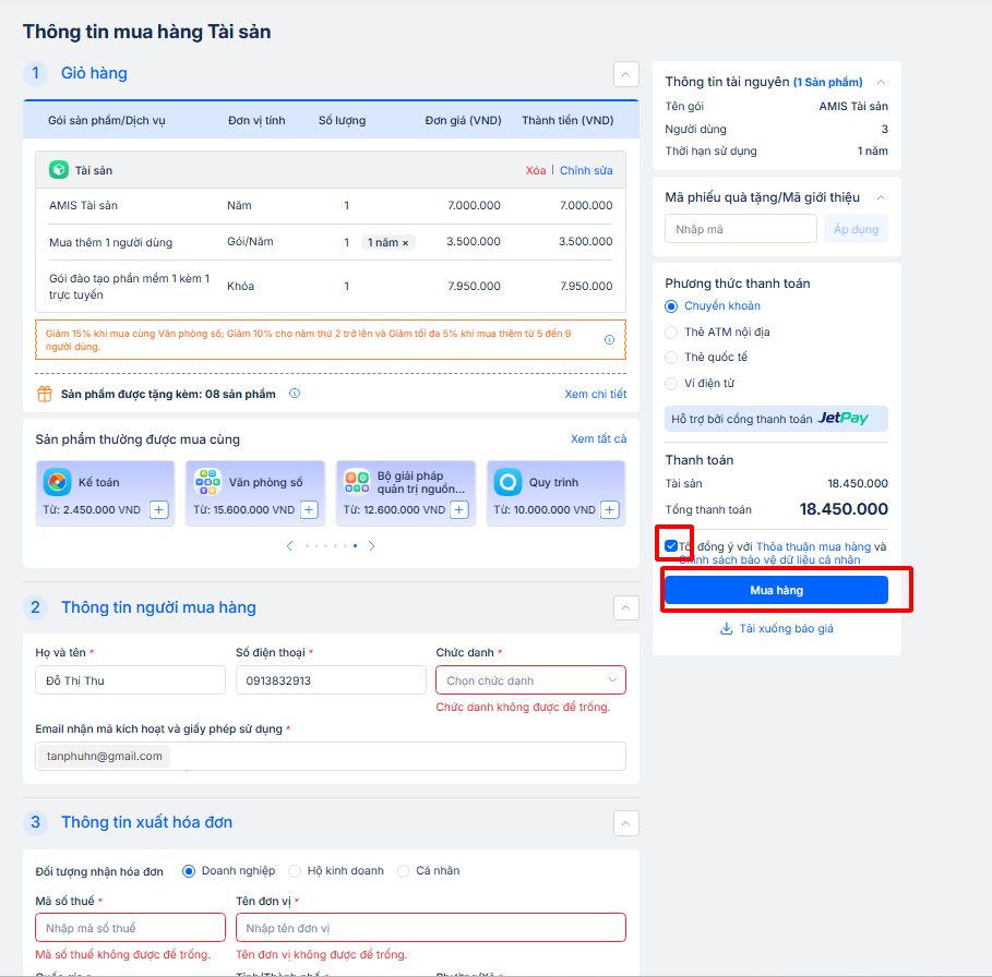 Bước 4: Chương trình hiển thị giao diện Thông tin mua hàng tài sản. Điền các thông tin còn thiếu. Ấn Mua hàng