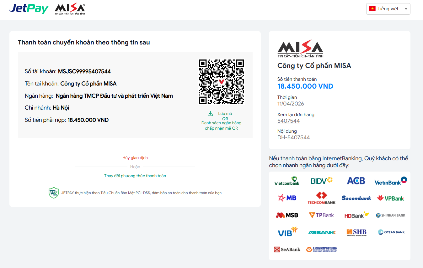 Bước 5: Hệ thống sẽ chuyển qua giao diện hiển thị các thông tin tài khoản và nội dung để thanh toán đơn hàng. Sau khi thanh toán sẽ nhận được Email để kích hoạt phần mềm