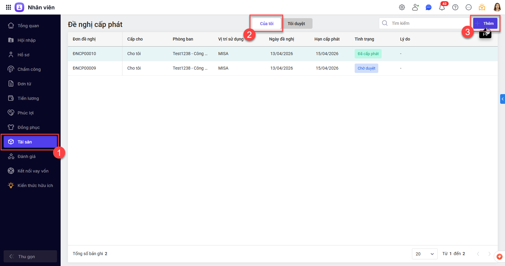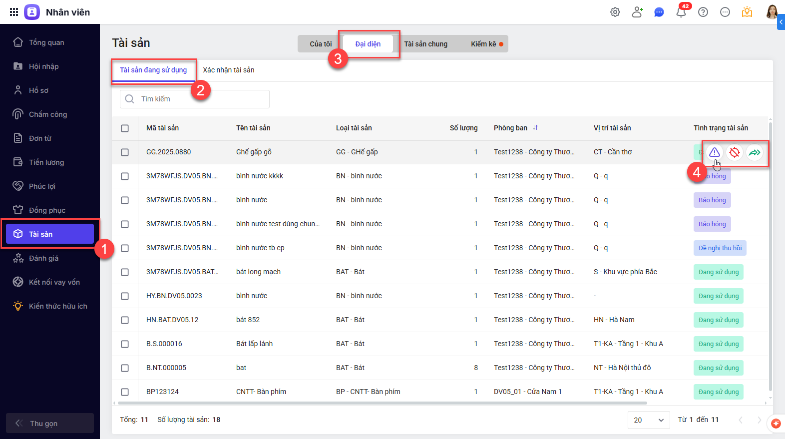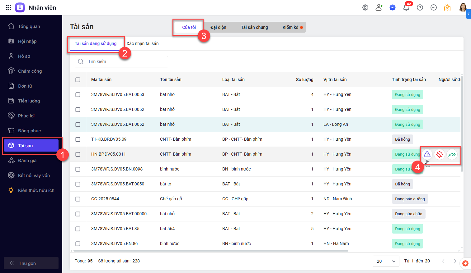 Tại tab Của tôi: gồm danh sách các tài sản được cấp cho nhân viên tự quản lý và sử dụng. Nhân viên có thể báo hỏng/báo mất/đề nghị thu hồi để gửi yêu cầu tới người quản lý tài sản.