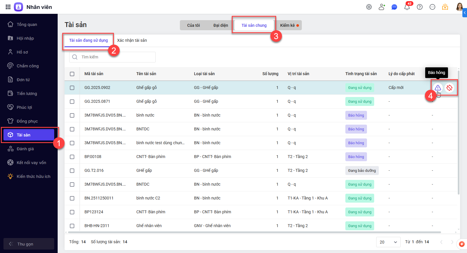 Tại tab Tài sản chung: gồm danh sách tài sản dùng chung với các nhân viên khác, nhân viên có quyền báo hỏng/báo mất để gửi yêu cầu tới người quản lý tài sản.