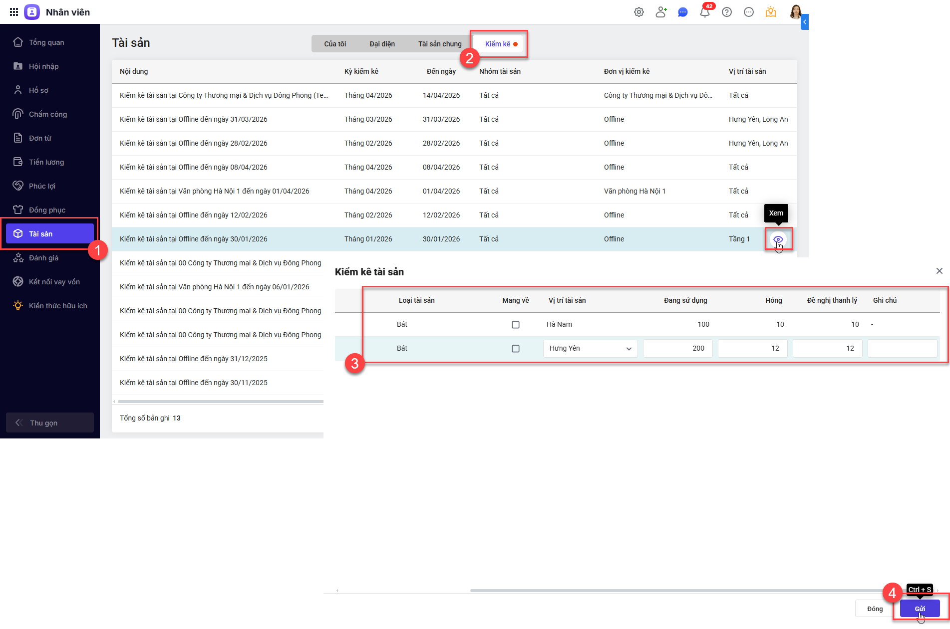 Tại tab Kiểm kê: gồm danh sách các đợt kiểm kê do người quản lý tài sản tạo yêu cầu gửi đến nhân viên tự kiểm kê tài sản liên quan đến mình. Nhân viên truy cập vào đợt kiểm kê để khai báo thông tin và nhấn Gửi để gửi phiếu kiểm kê tới người quản lý tài sản.