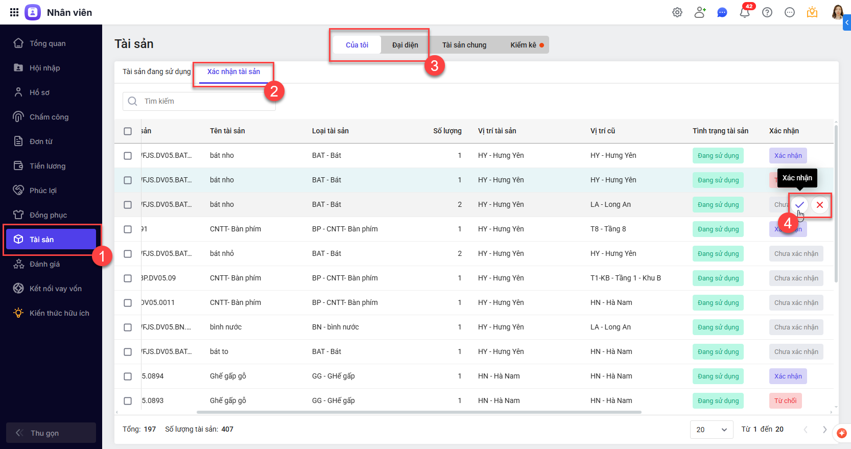 Tại tab Của tôi và tab Đại diện: Nhân viên có thể nhấn Xác nhận để sử dụng tài sản hoặc nhấn Từ chối để người quản lý tài sản thực hiện thủ tục thu hồi tài sản.