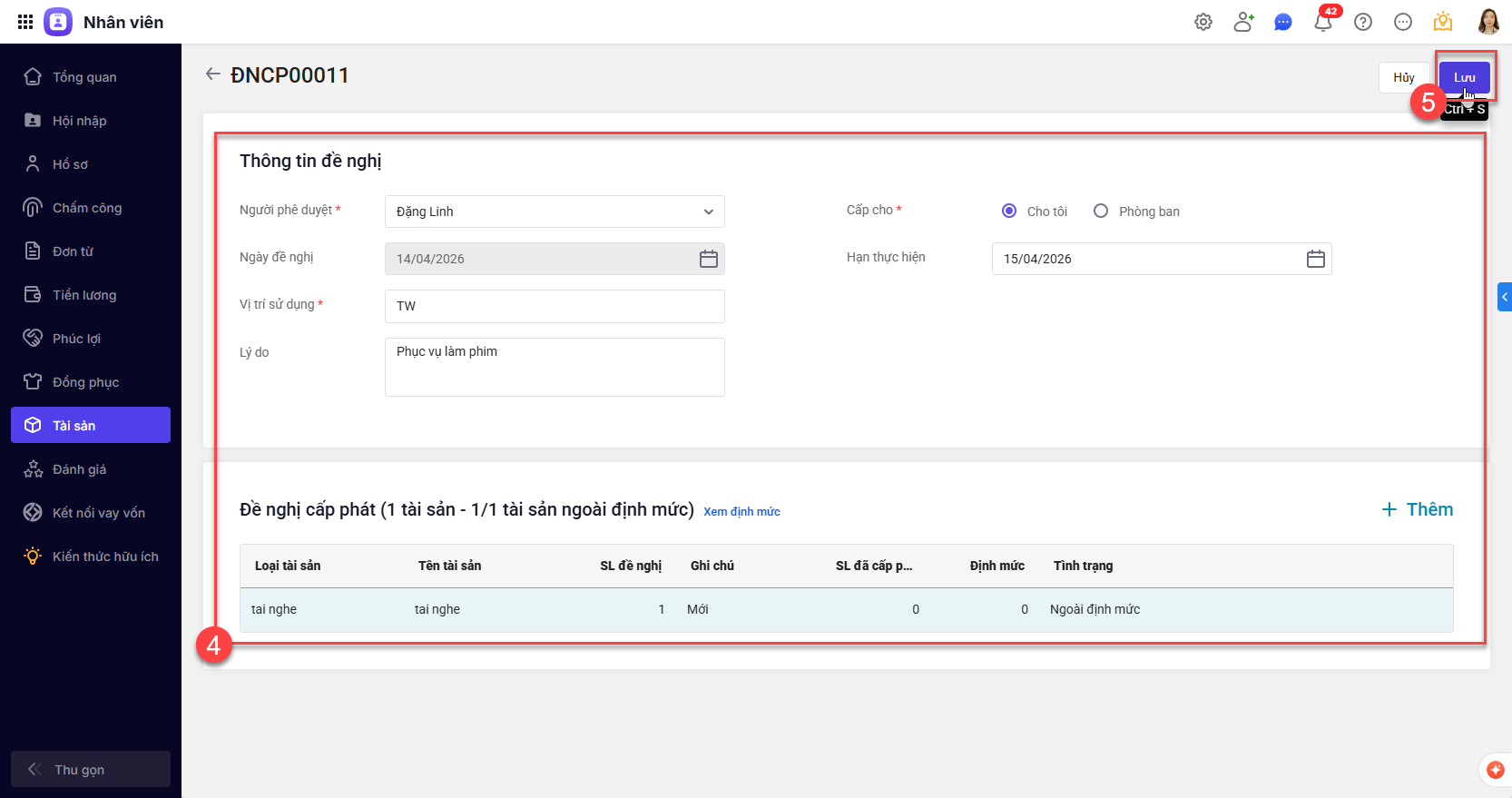 Thêm mới và quản lý danh sách các tài sản nhân viên đề nghị được cấp phát.