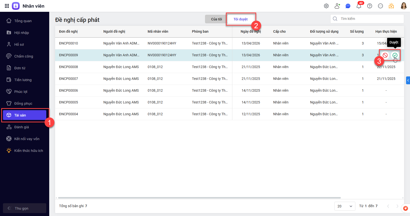 Người quản lý tài sản sẽ nhận được thông báo khi có đề nghị cấp phát tài sản từ nhân viên. Quản lý có thể xem xét Duyệt/Từ chối đề nghị.