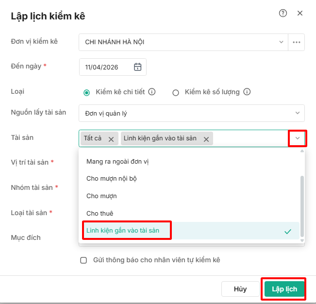 Bước 2: Tại giao diện Lập lịch kiểm kê, tích vào hình mũi tên ⏷ở Tài sản chọn Linh kiện gắn vào tài sản