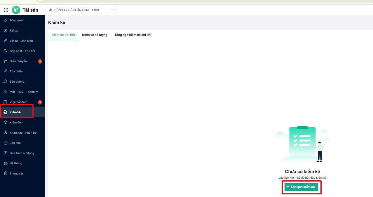 Bước 1: Trên Amis Tài sản, vào phân hệ Kiểm kê. Chọn tới mục Kiểm kê chi tiết hoặc Kiểm kê số lượng\Lập lịch kiểm kê: