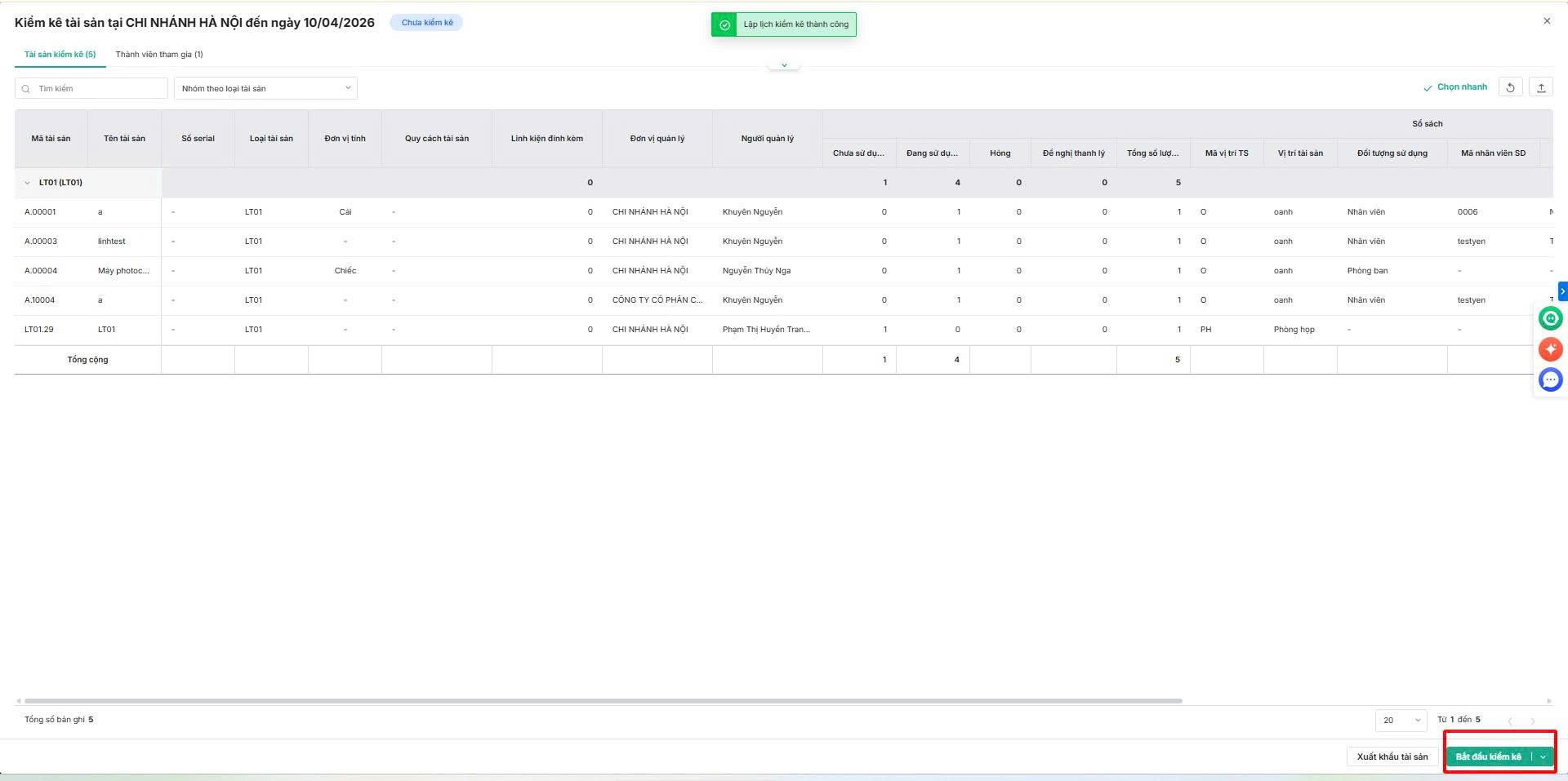 Bước 2: Trên chi tiết kiểm kê vật tư, ấn Bắt đầu kiểm kê: