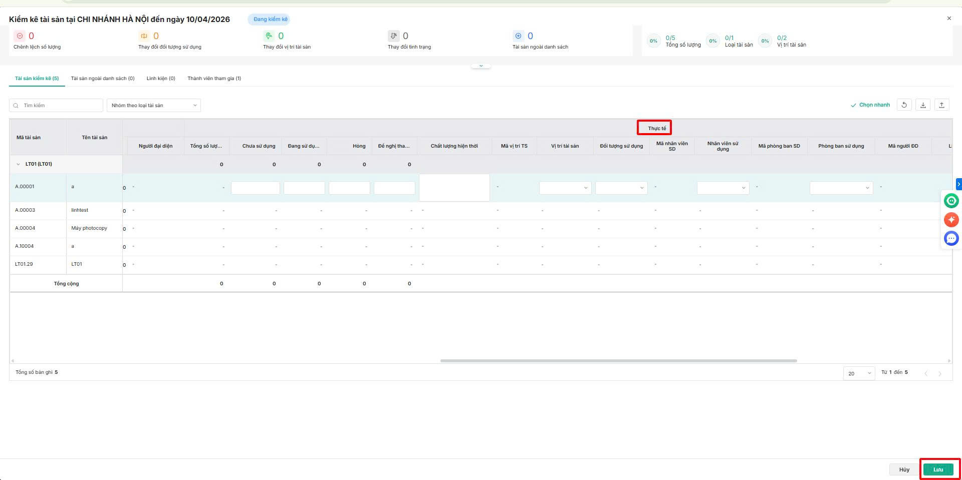 Bước 4: Trên chi tiết lịch kiểm kê vật tư, điền các thông tin thực tế về tài sản trên tab Thực tế ấn Lưu: