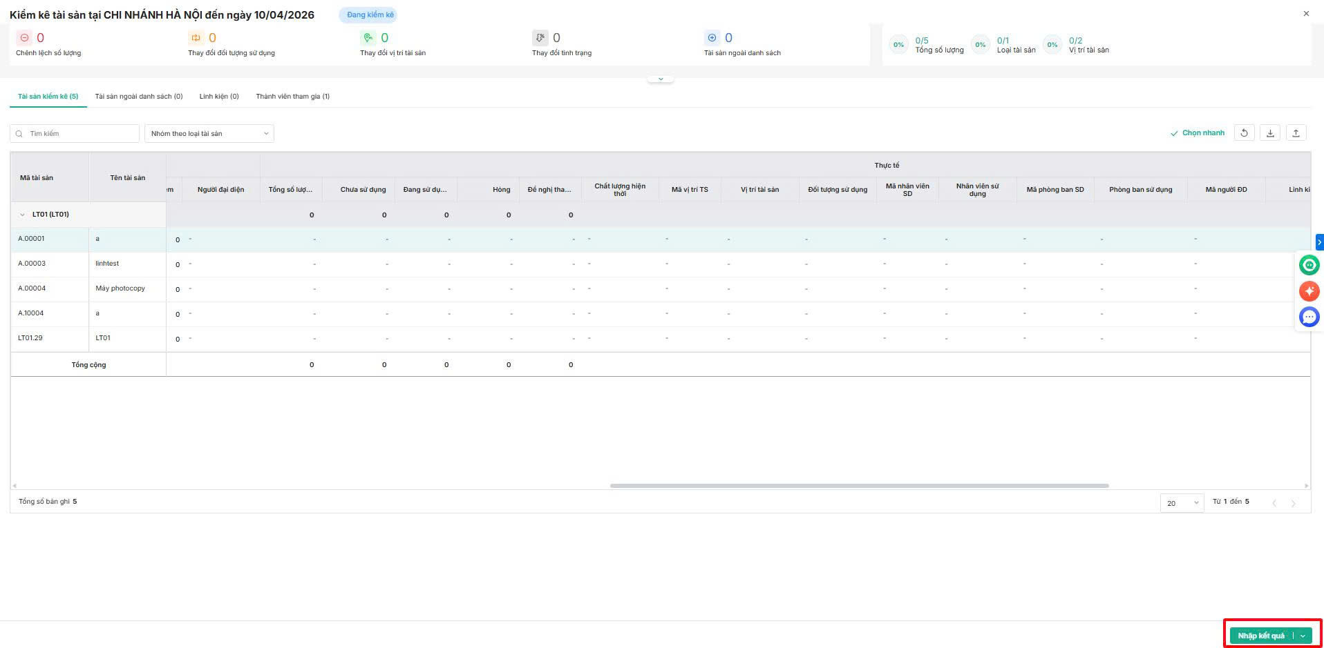 Bước 3: Trên chi tiết kiểm kê vật tư, ấn Nhập kết quả: