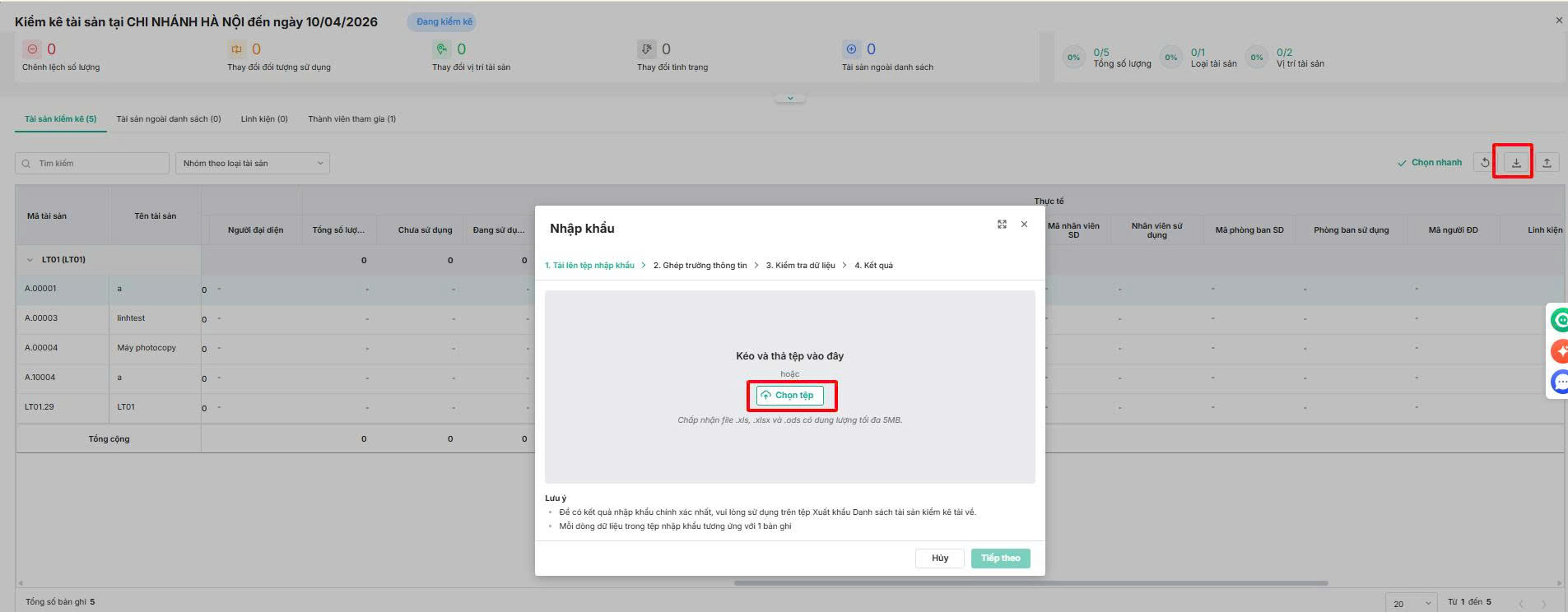 Lưu ý: Có thể nhập kết quả kiểm kê từ file excel của đơn vị bằng cách nhấn biểu tượng Nhập khẩu, sau đó thực hiện tải file lên phần mềm: