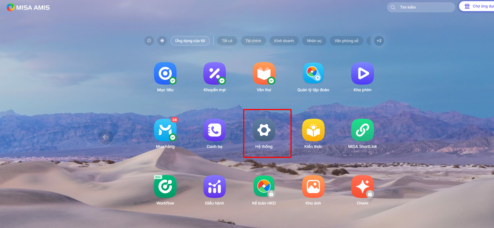 Bước 1: Đăng nhập vào ứng dụng AMIS tài sản, vào biểu tượng Hệ thống\Thiết lập hệ thống\Quản lý người dùng