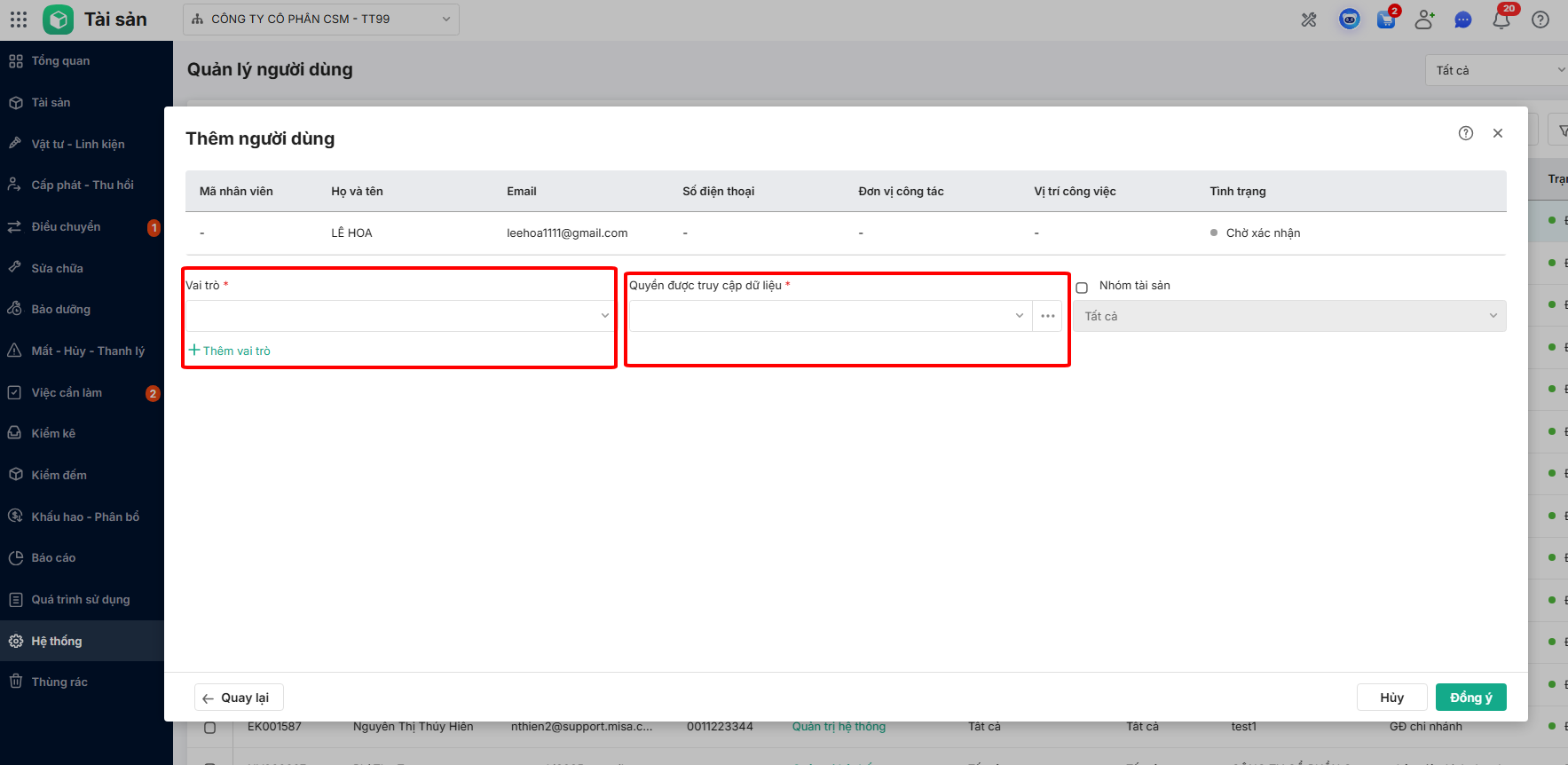 Bước 3: Chọn Vai trò và phân quyền truy cập dữ liệu. Nhấn Đồng ý