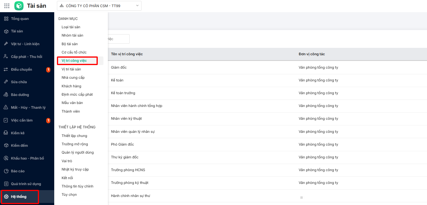 Bước 1: Trên AMIS Tài sản\Vào phân hệ Hệ thống\Chọn Vị trí công việc
