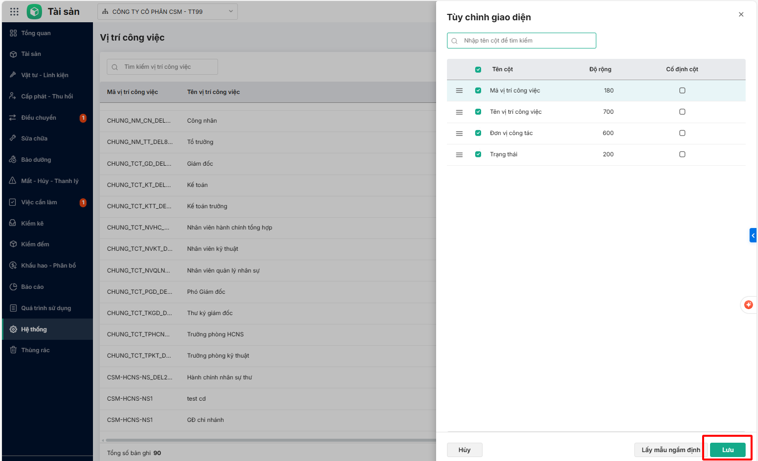 - Tùy chỉnh giao diện vị trí công việc (cột, độ rộng cột)