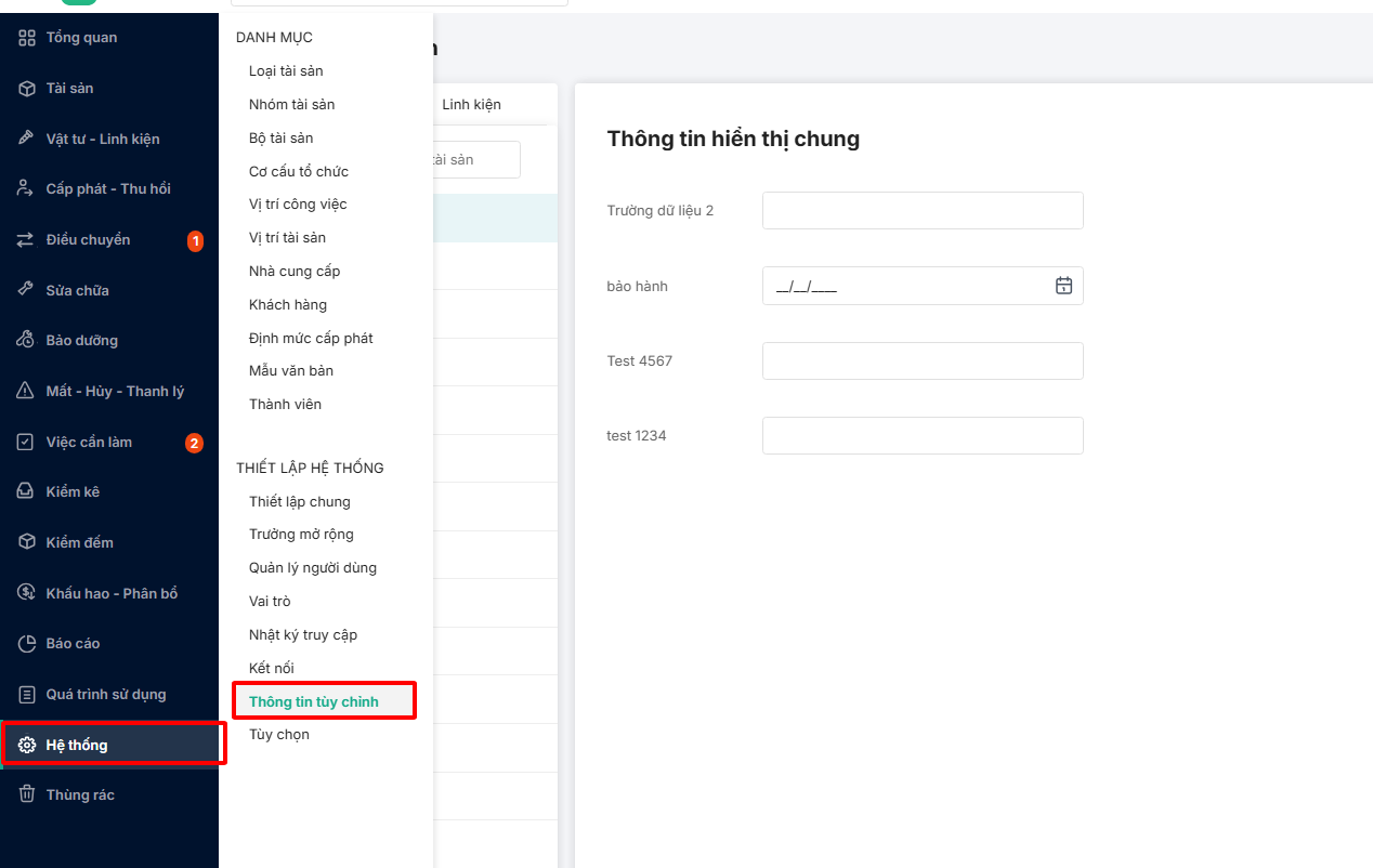 • Thiết lập thông tin tùy chỉnh cho nhóm tài sản