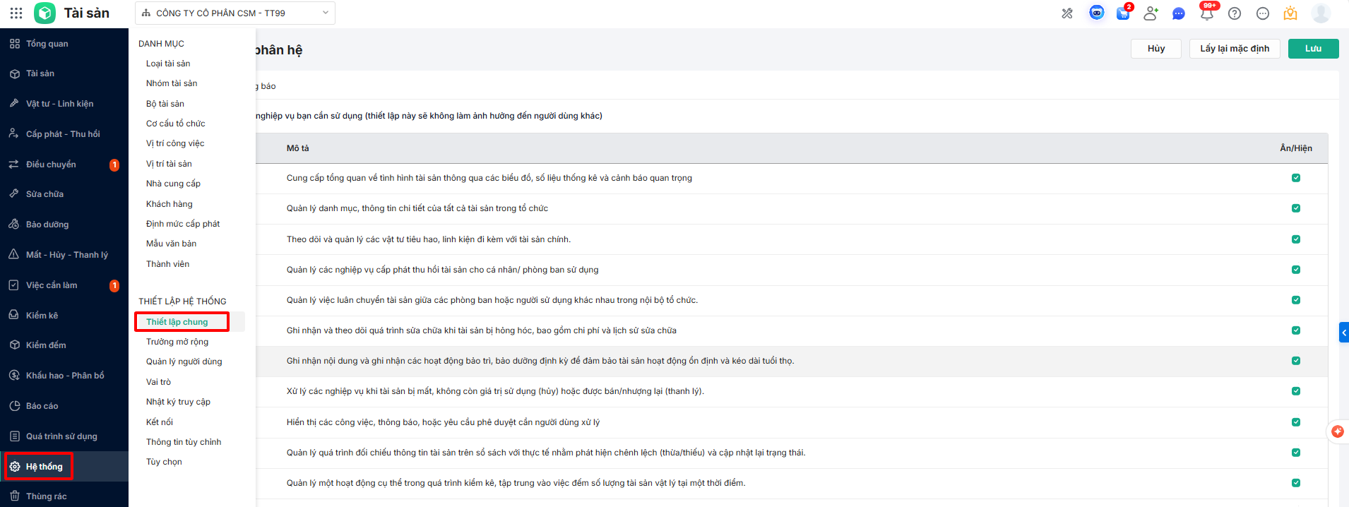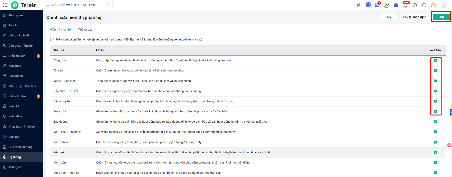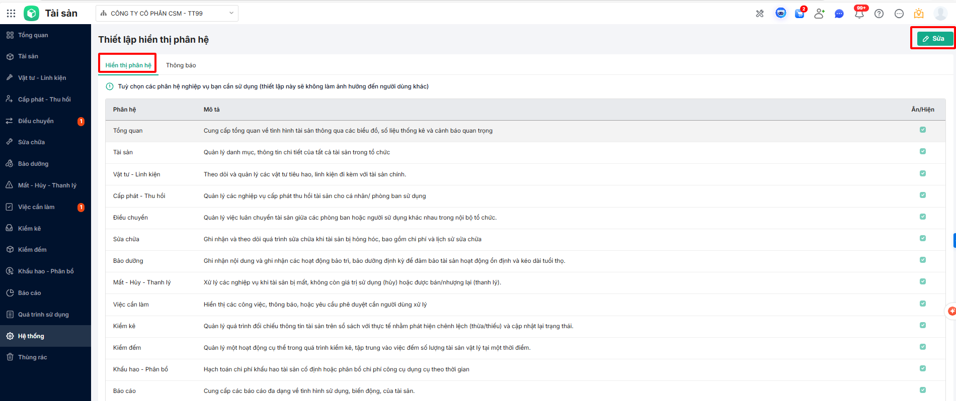 Hướng dẫn thiết lập hiển thị phân hệ và thông báo trên AMIS Tài sản