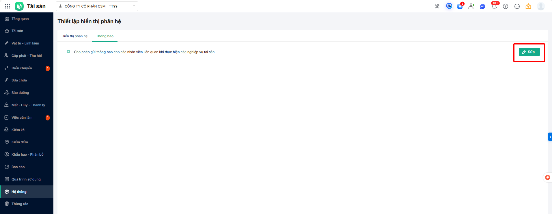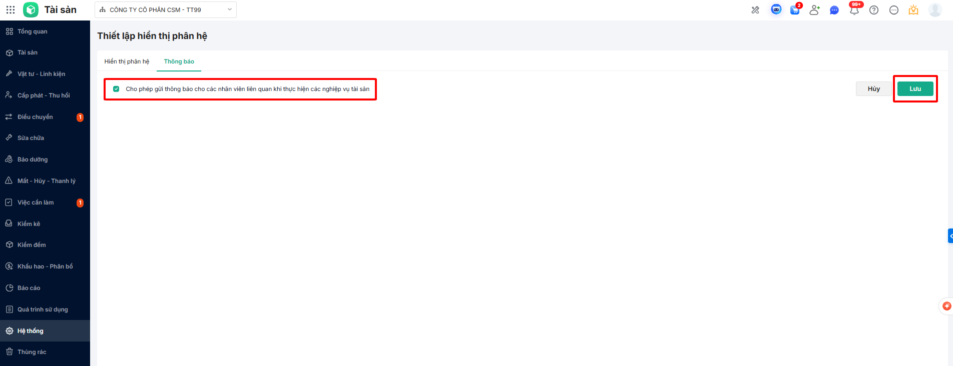 Bước 3: Chọn hoặc bỏ chọn Cho phép gửi thông báo cho các nhân viên liên quan khi thực hiện các nghiệp vụ tài sản theo nhu cầu