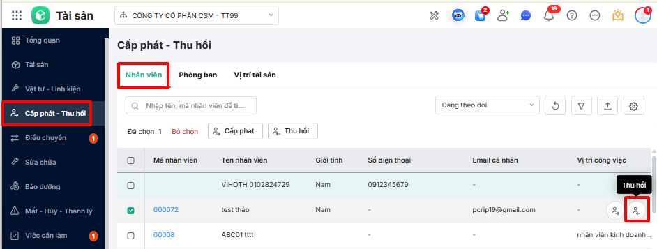 Bước 1: Trên giao diện AMIS Tài sản\chọn Cấp phát-Thu hồi\Tích chọn nhân viên để thu hồi tài sản\Chọn biểu tượng Thu hồi.