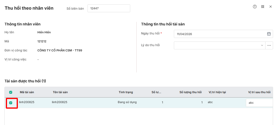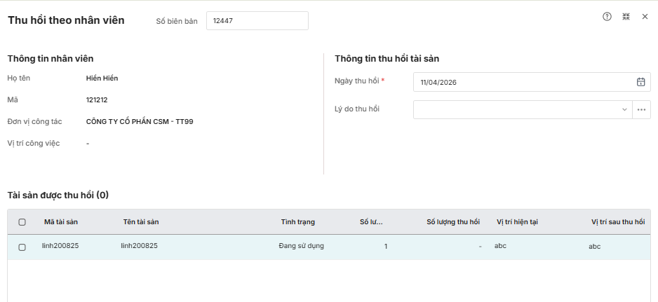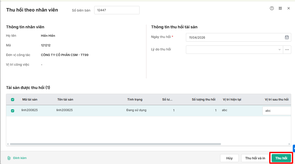 Bước 4: Nhấn Thu hồi để thu hồi tài sản của nhân viên.
