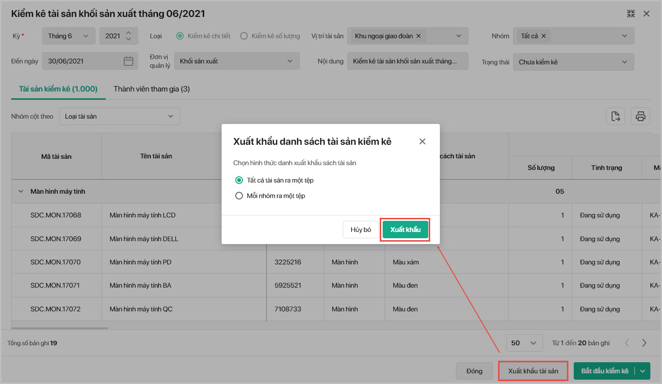2.1. Xuất khẩu danh sách tài sản ra file excel
