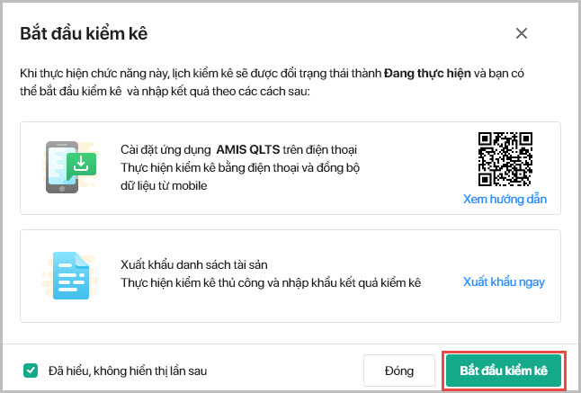 - Người dùng có thể thực hiện kiểm kê bằng điện thoại và đồng bộ dữ liệu từ mobile hoặc thực hiện kiểm kê thủ công và nhập khẩu kết quả kiểm kê.