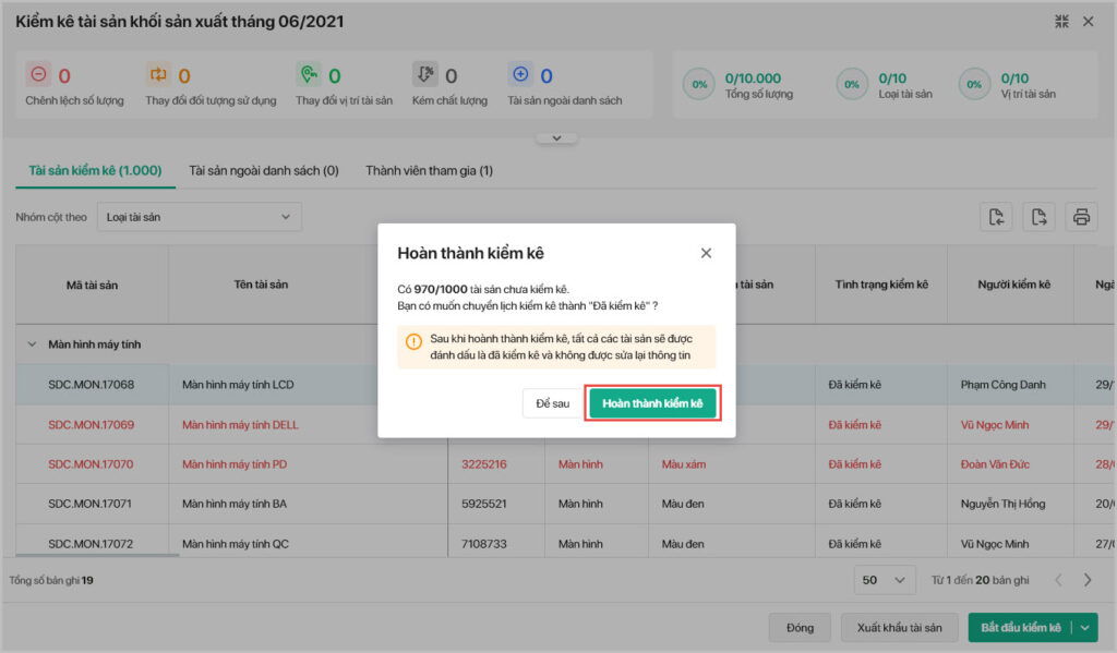 Bước 2: Nhấn Bắt đầu kiểm kê để thực hiện quá trình kiểm kê tài sản: