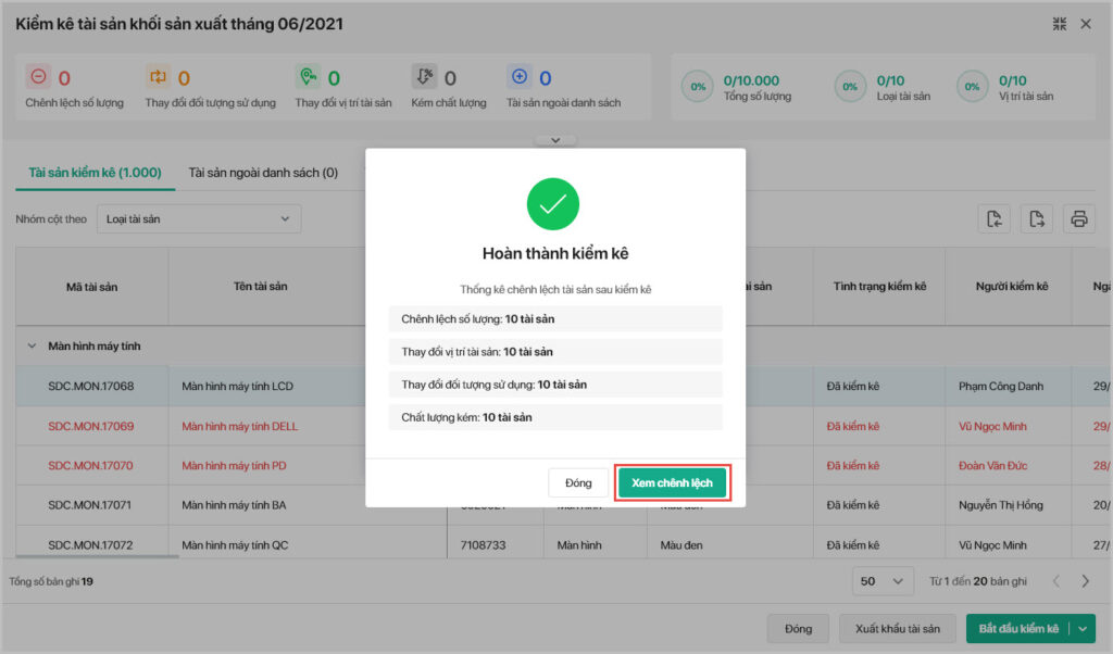 Lưu ý: Nhấn Xem chênh lệch để xem chênh lệch tài sản giữa thực tế kiểm kê thực tế và chương trình.