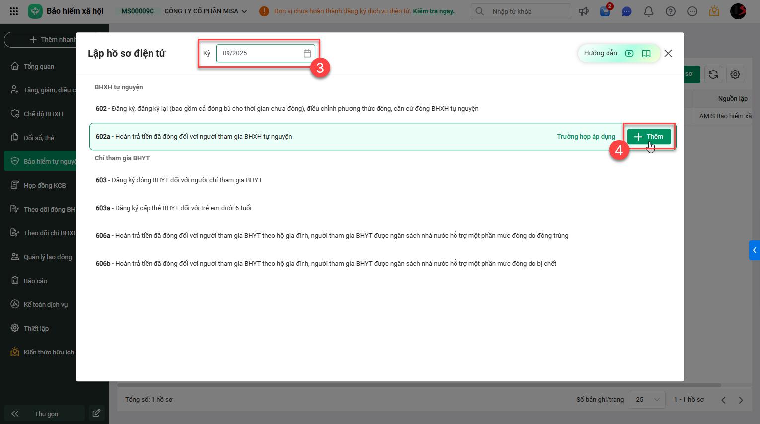 2. Chọn thời gian cho kỳ kê khai\chọn thủ tục 602a\nhấn Thêm.