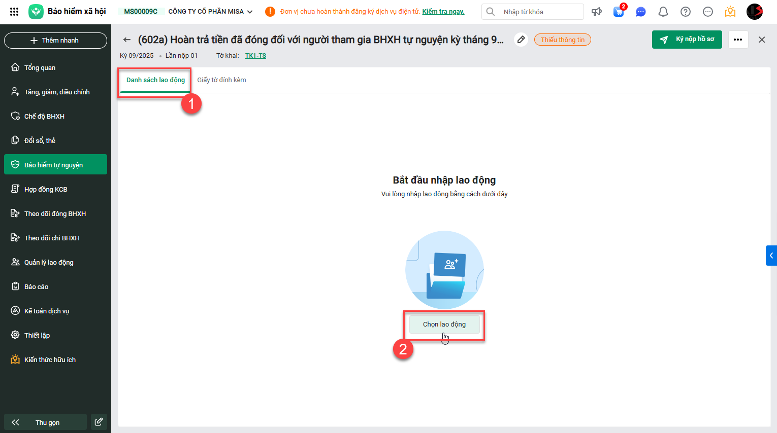 Nhấn Chọn lao động để thêm lao động vào thủ tục.
