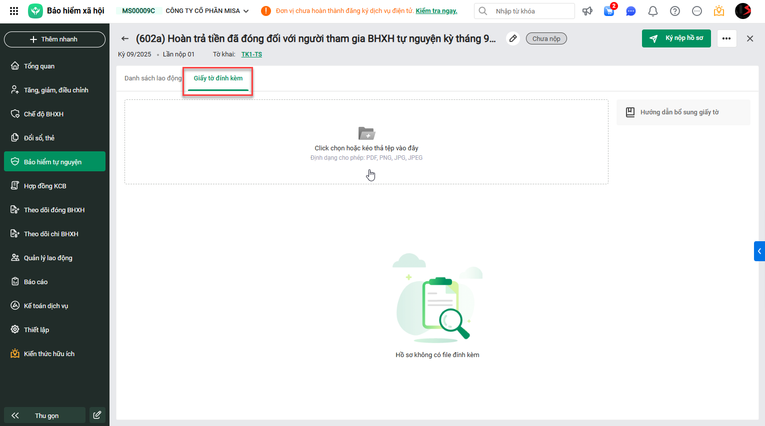 Anh/Chị tải lên giấy tờ tại tab Giấy tờ đính kèm (đính kèm ảnh chụp sổ BHXH trong trường hợp trùng thời gian đóng BHXH bắt buộc hoặc giấy chứng tử trong trường hợp qua đời).