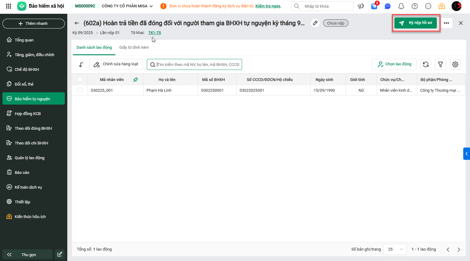 Hồ sơ sau khi ký nộp sẽ được chuyển lên cơ quan BHXH tiếp nhận và cập nhật trạng thái về phần mềm. Anh/Chị có thể theo dõi trạng thái hồ sơ tại cột Trạng thái hoặc Xem kết quả xử lý đối với hồ sơ có trạng thái Chờ kết quả.