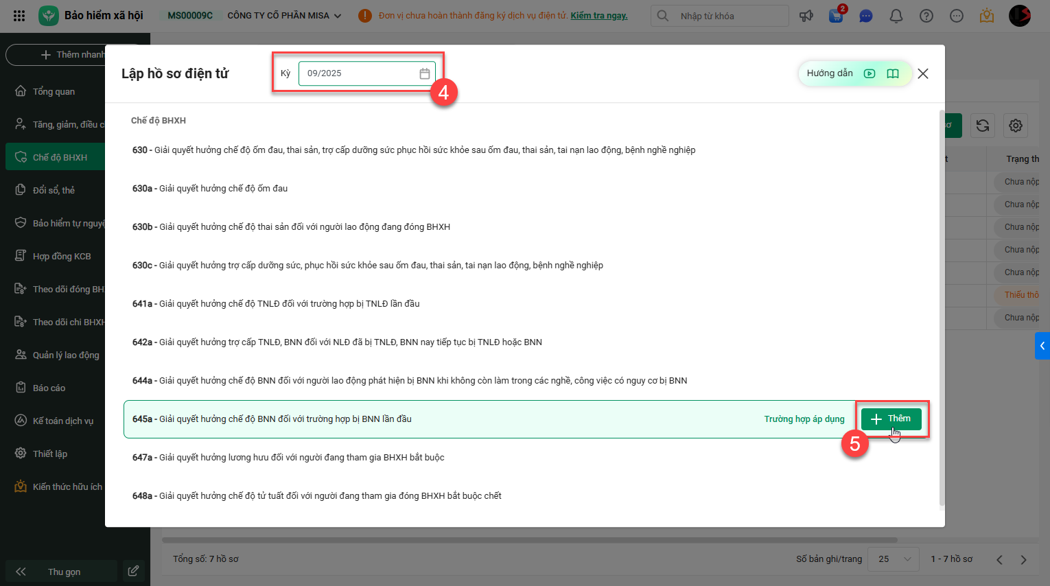 2. Chọn thời gian cho kỳ kê khai\chọn thủ tục 645a\nhấn Thêm.