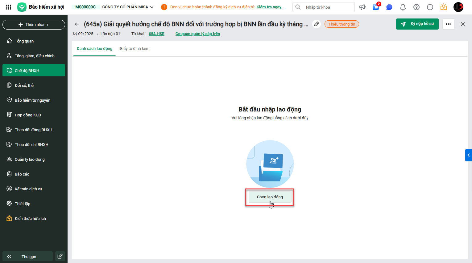 1. Nhấn Chọn lao động để thêm người lao động vào thủ tục và thực hiện khai báo thông tin hưởng chế độ cho người lao động.