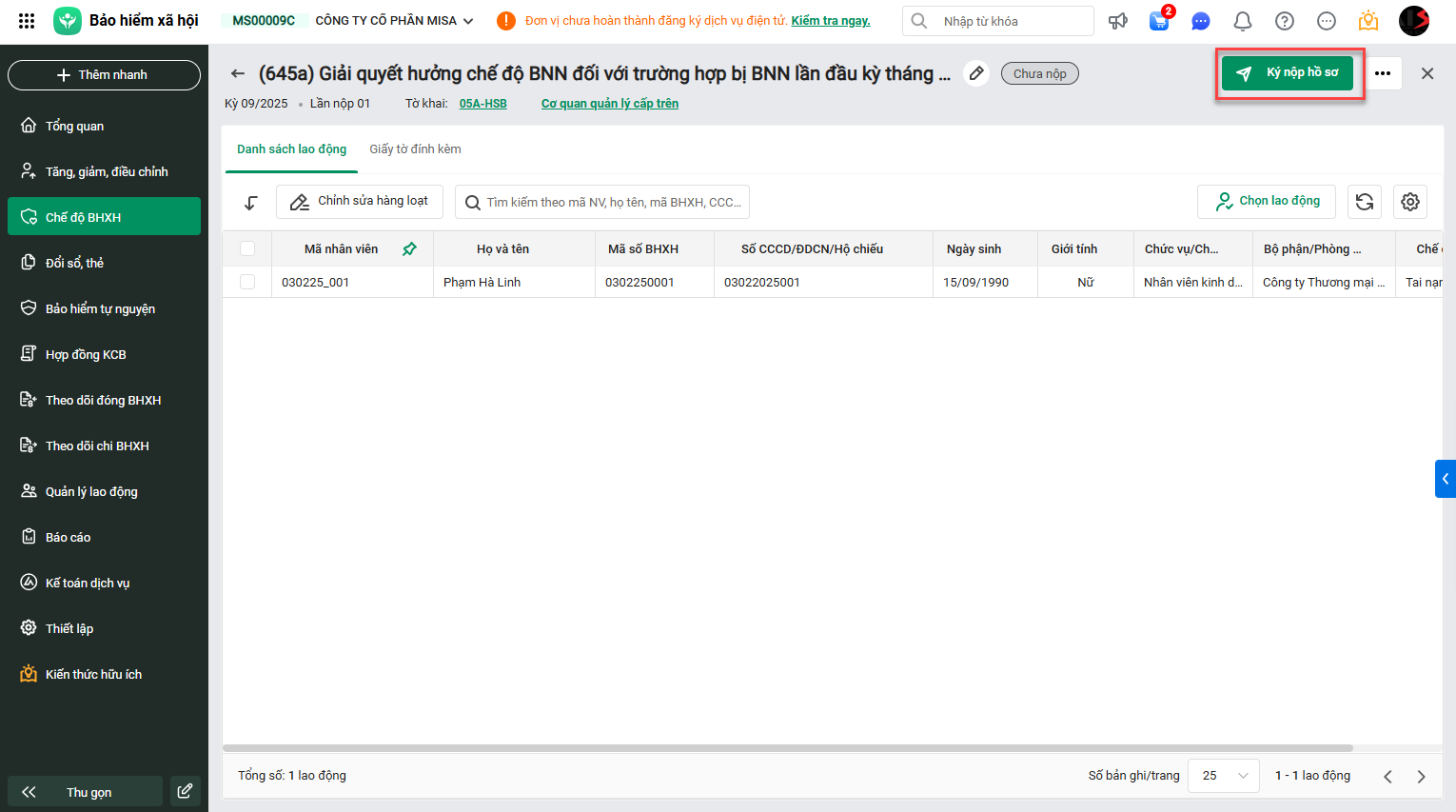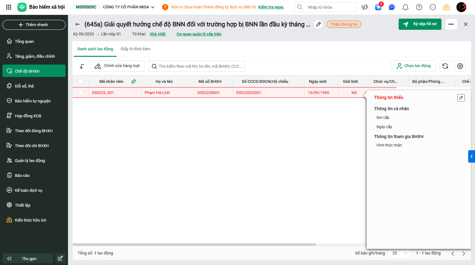 2. Chỉnh sửa và bổ sung thông tin còn thiếu bằng cách click vào dòng lao động báo đỏ hoặc nhấn Sửa.