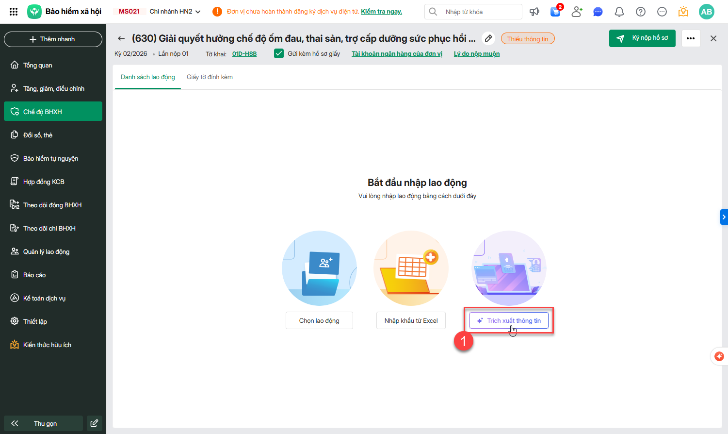Tại hồ sơ chế độ BHXH (630, 630a, 630b)\nhấn Trích xuất thông tin.