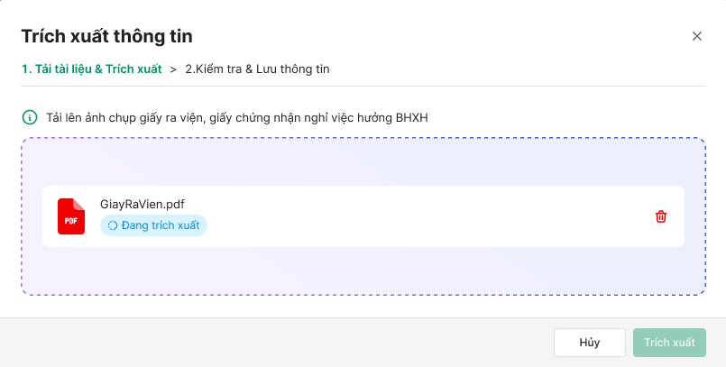 Anh/Chị tải lên ảnh chụp giấy ra viện, giấy chứng nhận nghỉ việc hưởng BHXH định dạng Định dạng PDF, PNG, JPG, JPEG. AI sẽ đọc và trích xuất thông tin.