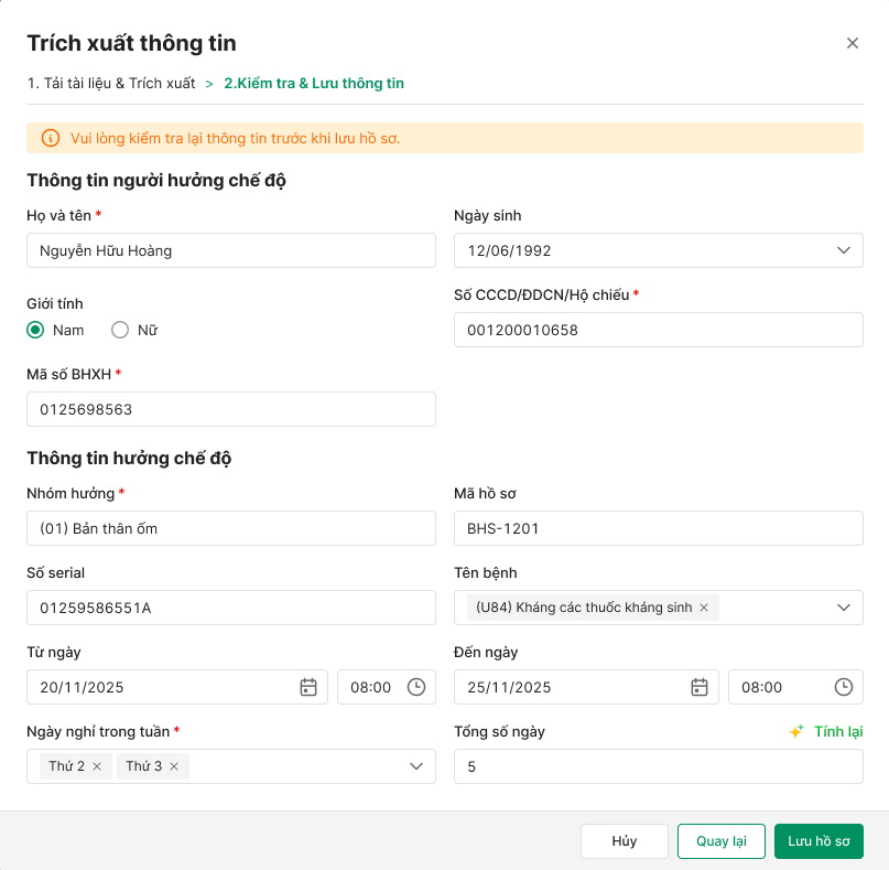 Anh/Chị kiểm tra thông tin, chỉnh sửa (nếu cần) sau đó nhấn Lưu hồ sơ để lưu thông tin vào hồ sơ giải quyết chế độ.