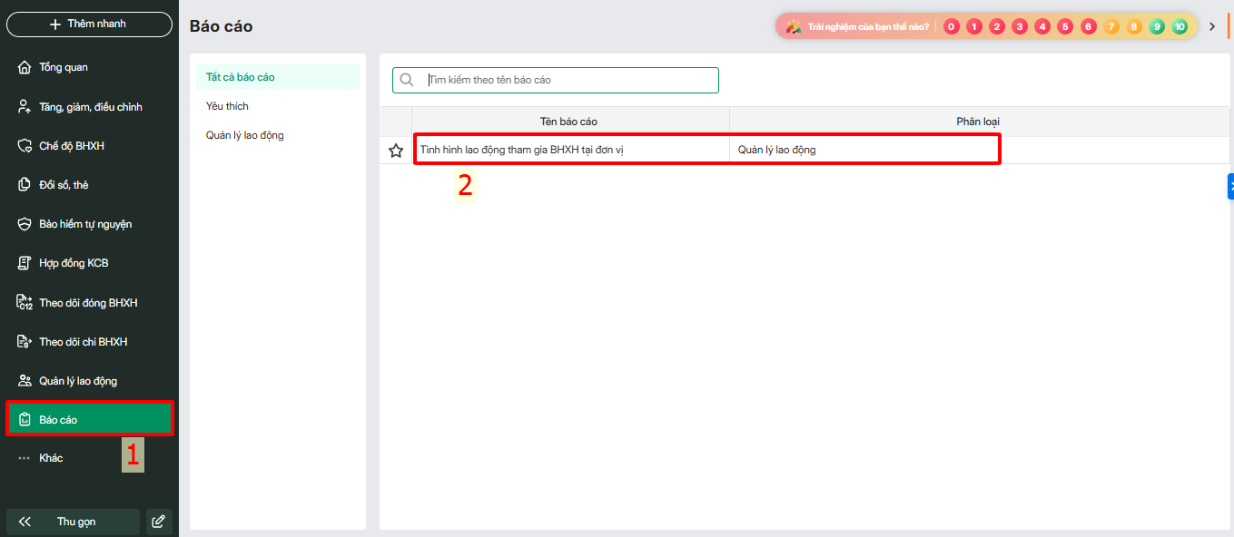 Tại phân hệ Báo cáo, chọn Tình hình lao động tham gia BHXH tại đơn vị.