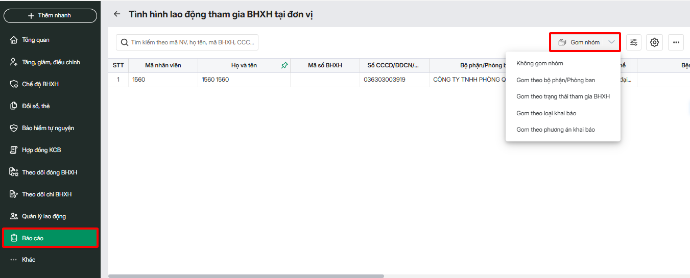 - Gom nhóm lao động theo bộ phận/phòng ban, trạng thái tham gia BHXH, loại khai báo, phương án khai báo.