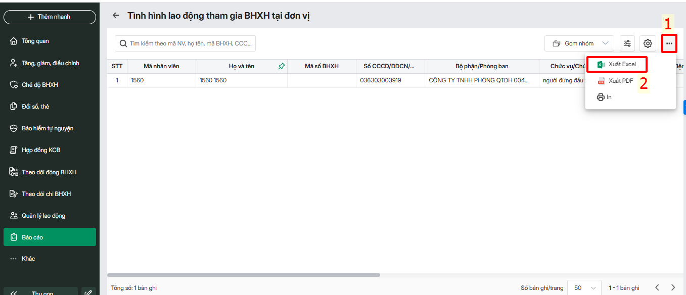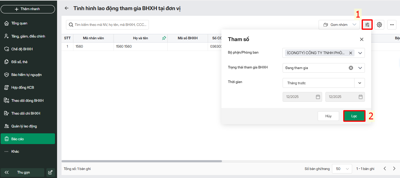 - Lọc báo cáo theo các tham số bộ phận/phòng ban, trạng thái tham gia BHXH, thời gian.